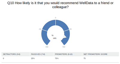 - Critically, over 75% of respondents would highly recommend WellData. This brings our Net Promoter Score to a staggering 75, when the average for our industry is just 39%.